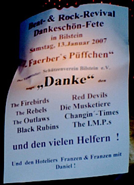 Die Oldie-Night war auch eine schöne und seltene Gelegenheit, wo sich Musiker aus der damaligen Szene nach vielen Jahren wieder gesehen haben.Jede Band bekam nur ein kleines Honorar. Dafür lud der Schützenverein alle Musiker zu einem Musikertreff in "Faerbers Püffchen" ein. Es war eine Riesensause und es gab wieder viel zu erzählen, und - Live-Music aller anwesenden Musiker in wechselnder Besetzung. So etwas hat es noch nie gegeben: the outlaws spielten mit black rubins, the firebirds mit Changin Times und es gab auch total gemischte Formationen.