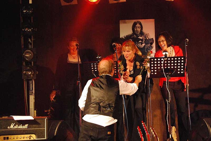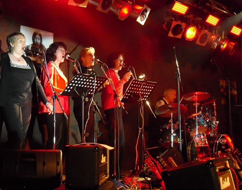 4 Frauen aus dem Chor wollten das Experiment mitmachen. Hierbei wurden sie tatkräftig unterstützt von Michael Nathen, einem der besten Dirigenten aus dem hiesigen Bereich. Nach einigen Übungsabenden kam der erste Auftritt im November 2009 bei der Oldie-Night in Bilstein. Es war verständlich, dass alle Beteiligten etwas nervös waren, aber die Premiere war ein voller Erfolg und die 4 Damen sind eine Bereicherung für den Gesamtsound der Band und natürlich auch ein optischer Blickfang.
