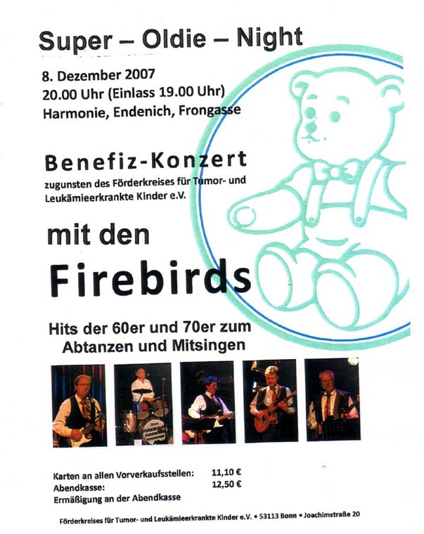 2010 und 2011. Wie in den Jahren zuvor spielten the „FIREBIRDS“ wieder in Bonn in der Harmonie. Und wie immer spendeten sie ihre Gage Vereinen, die schwerstbehinderte Kinder und Jugendliche unterstützen. Dieses soziale Engagement hat übrigens Tradition in der langen Geschichte der Band.