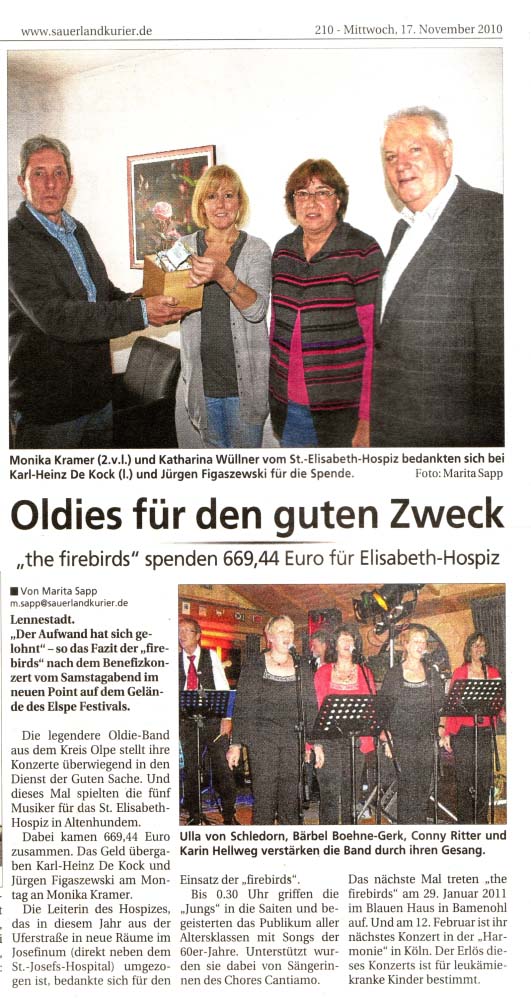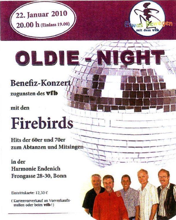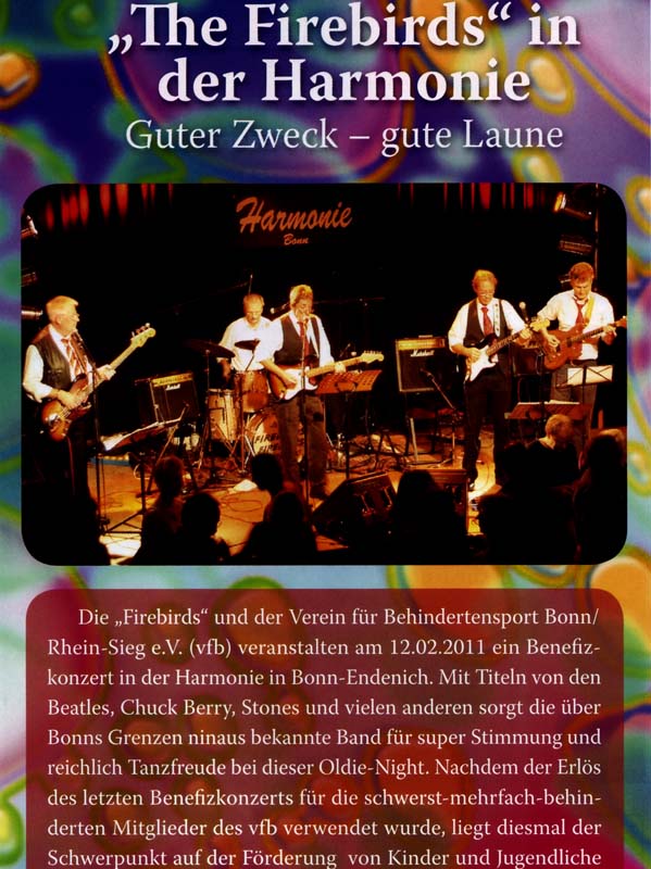 2010 und 2011. Wie in den Jahren zuvor spielten the „FIREBIRDS“ wieder in Bonn in der Harmonie. Und wie immer spendeten sie ihre Gage Vereinen, die schwerstbehinderte Kinder und Jugendliche unterstützen. Dieses soziale Engagement hat übrigens Tradition in der langen Geschichte der Band.
