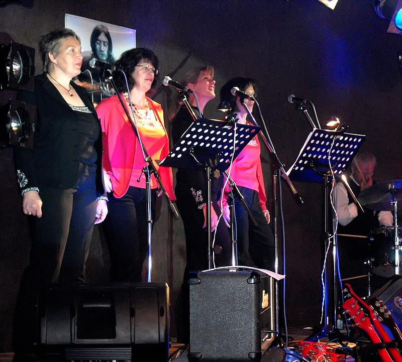 4 Frauen aus dem Chor wollten das Experiment mitmachen. Hierbei wurden sie tatkräftig unterstützt von Michael Nathen, einem der besten Dirigenten aus dem hiesigen Bereich. Nach einigen Übungsabenden kam der erste Auftritt im November 2009 bei der Oldie-Night in Bilstein. Es war verständlich, dass alle Beteiligten etwas nervös waren, aber die Premiere war ein voller Erfolg und die 4 Damen sind eine Bereicherung für den Gesamtsound der Band und natürlich auch ein optischer Blickfang.