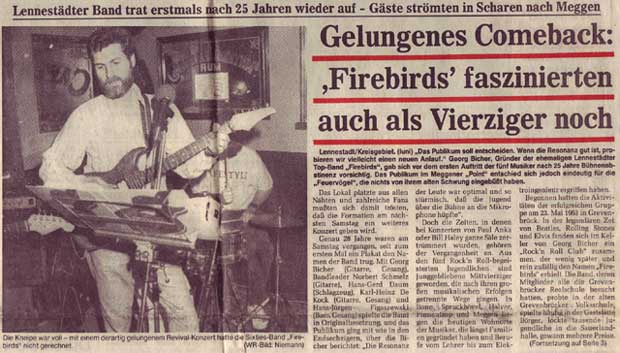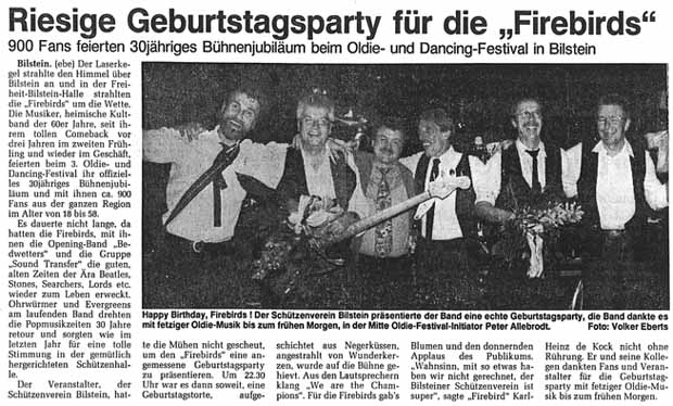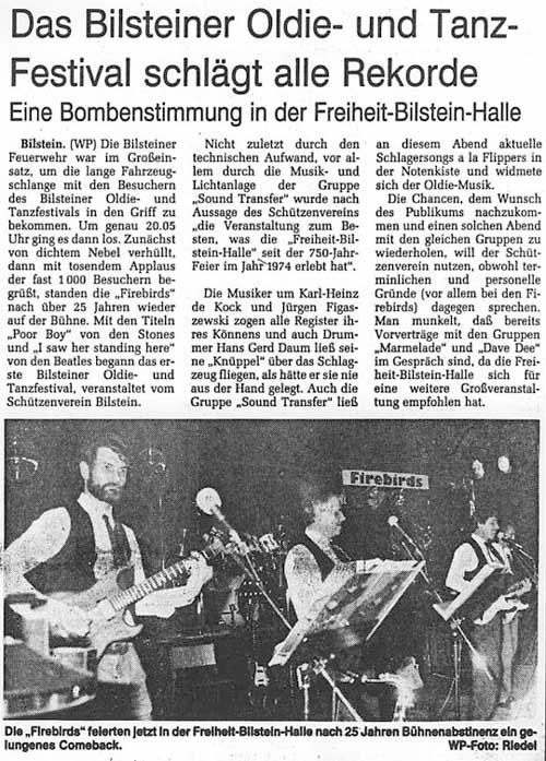 Alle sind zufrieden, nur Wolfgang Schütz quält weiter und als dann Peter Allebroodt zum Ball nach Bilstein ruft, können sich die Musiker nicht mehr wehren. Am 28.Nov. 92 stehen die "FIREBIRDS" auf der Bühne und 1000 Oldie - Fans wollen ihre Musik hören. Das ist der erste große Auftritt für die Band - nach all den Jahren...!