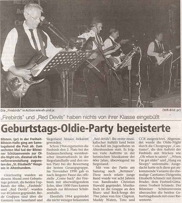 November 2005Im November 2004 feierten die firebirds ihr 40 jähriges Jubiläum in der Schützenhalle Bilstein. Wir hatten viel Spaß und Hans-Gerd, der bereits an einer unheilbaren Krankheit litt, war bei uns. Schlagzeug spielen konnte er nicht mehr.