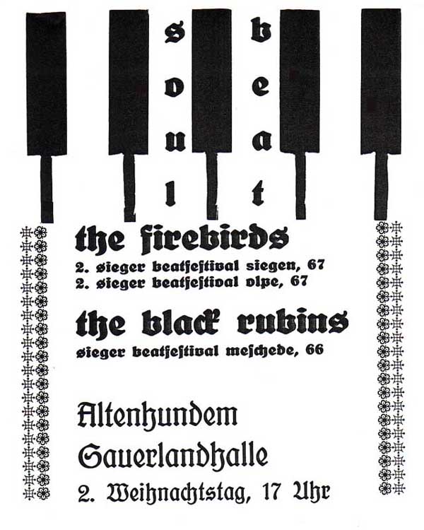 Die "FIREBIRDS" ließen sich durch den verpassten Sieg nicht entmutigen. Die damaligen Bands kannten und respektierten sich. Sicher - es war ein ewiger Wettstreit um die Gunst des Publikums, aber in Freundschaft ausgetragen. Besonders mit den "OUTLAWS" aus Gerlingen/Wenden klappte die Zusammenarbeit zum Wohl der Musik und der Musikfans. Im "Gogo - Mobil - Coupe", die Bezeichnung ist fast so lang wie dieser Autotyp, wurden Lautsprecher - Boxen. Gitarren und Freundinnen transportiert. Der Chef eines Bandmitglieds lieh den Firmenwagen aus und half so, das die Truppe mobil war und auch ihre Plakate an die Sauerländer Fichten nageln konnte. Ein R4 wurde mit Plakaten zugepappt und rollte als Werbeträger durch die Region - die "FIREBIRDS" kommen!!! Ja, so war das damals! Am 2. Weihnachtsfeiertag 67 spielten die Freunde und die "Black Rubins" aus Attendorn, in der Sauerlandhalle in Altenhundem und mancher Beat- u. Soulfan tanzte sich den Weihnachtsspeck vom Leib.