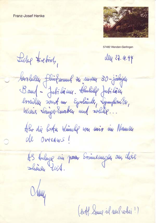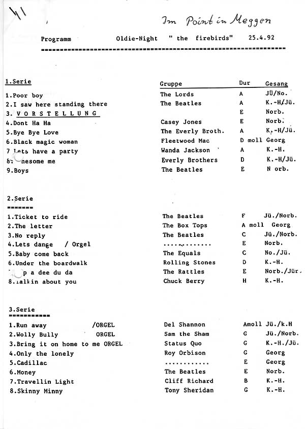 Aber die Riesenfete in Bilstein, zum 30-jährigem Bühnenjubiläum der "FIREBIRDS", ist geplant und in die Geschichte eingegangen! Karl Heinz übt ein halbes Jahr dafür - es soll perfekt werden und die Finger sollen das tun, was der Kopf ihnen sagt - schnell und präzise über die Saiten der Melodie - Gitarre huschen und die alten Hits aufleben lassen ! Die Band ist heiß auf die Party - zuerst ein paar Stücke aus der Tanzmusik - Zeit, der Ursprung wird nicht vergessen! Auf der großen Leinwand wird eine Dia - Show gezeigt - Erinnerungen an frühere Auftritte. Dann wird Beat- u. Soulmusik gespielt und etwa 650 Freunde tanzen und vergessen die Zeit. Karl Heinz verliest eine Grußbotschaft an die Bands der sechziger Jahre. Er hatte sich einen Spickzettel gemacht, mit den Namen der Gruppen, an die er sich erinnern konnte. Ich bin total gerührt, als ich den Namen "The Countdown" entdecke - er hat uns kleinen Nichtskönner nicht vergessen ! Franz-Josef Henke von den "OUTLAWS" hat einen Glückwunschbrief geschrieben - alte Kumpels eben, die Beatmusiker ! Es muss ein warmer November gewesen sein, 1994 - bei soviel heißer Musik in Bilstein und ich war nicht dabei...