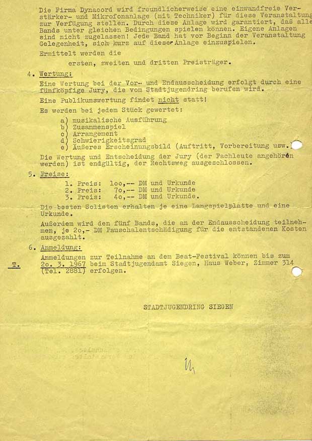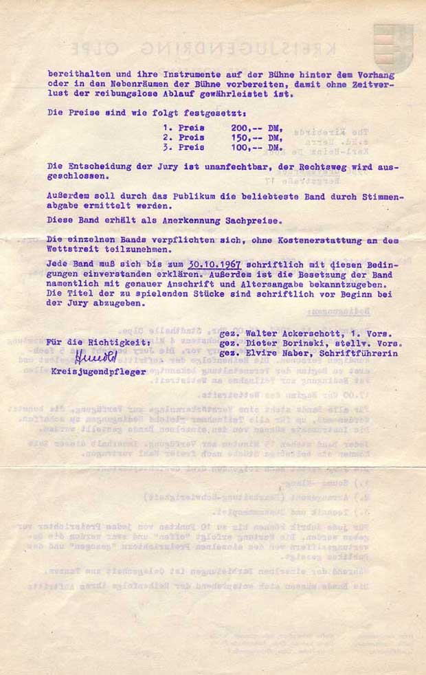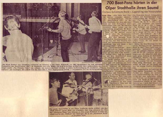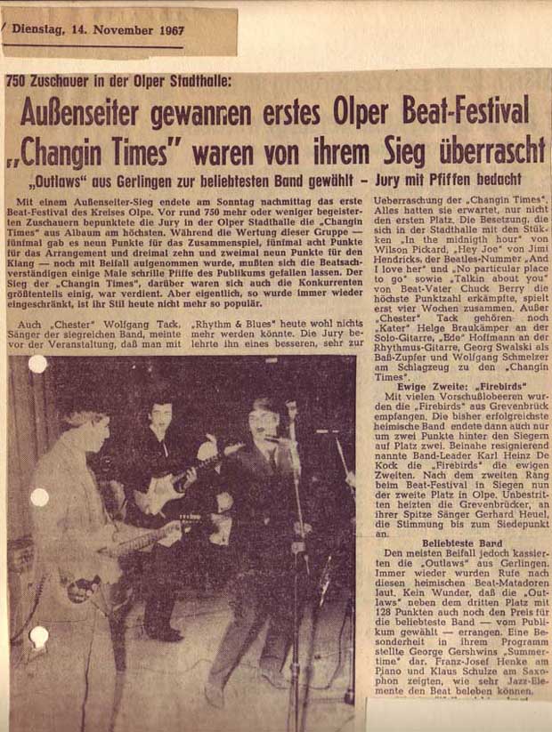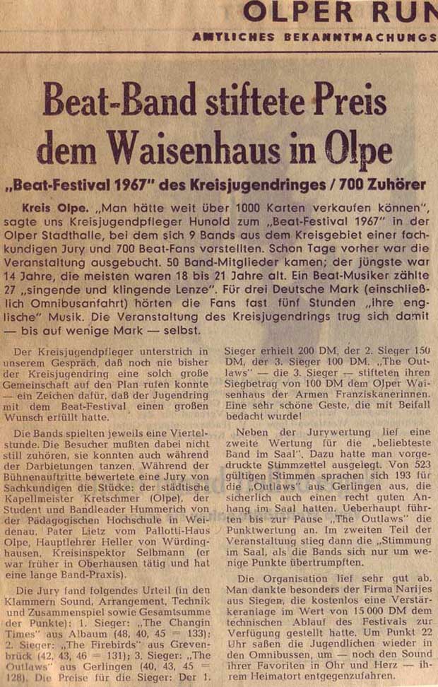 (für eine größere Ansicht die Zeitungsausschnitte anklicken)Klaus und ich merken: K. H De Kock erinnert sich gut und gerne an die Zeit. Er blättert in Alben und Ordnern, zeigt Fotos, Plakate und Urkunden und erzählt so lebendig, als hätten die 37 Jahre nicht stattgefunden! Am Sonntag, 12.Nov. 67, veranstaltet der Kreisjugendring ( was für ein Wort !!! ) auch einen Beat - Wettbewerb in der Olper Stadthalle. Ich nahm als Bassist der "Countdown" teil, die "FIREBIRDS" wurden Zweite, was vielen Zuhörern unverständlich war - sie sahen die Band als Sieger. Die "Changin´Times" holten den ersten Platz, die "OUTLAWS" den dritten und wurden vom Publikum zur beliebtesten Band gewählt. K. H. De Kock`s Kommentar: Wir, die ewigen Zweiten... Es hatten neun Gruppen gespielt, die "Countdown" wurden als 8. Sieger bewertet - was waren wir noch Anfänger! Erinnert Ihr Euch noch an diesen Abend, Ihr mittlerweile gereiften Olper Beatfans ?
