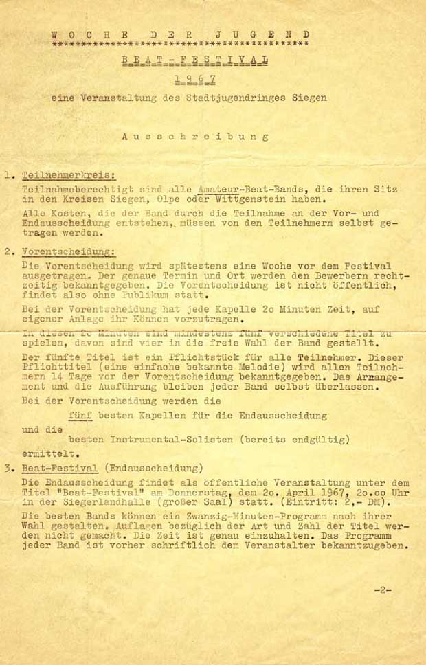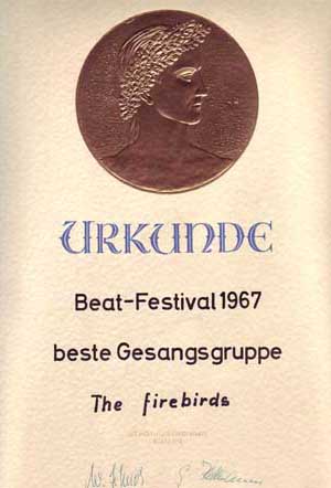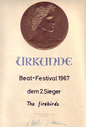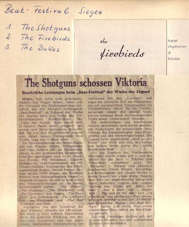 Für die FIREBIRDS wird das "für einen guten Zweck" Spielen zur Tradition. Die Freunde verdienen ihr Geld mit Arbeit, sind zielstrebig, beruflich erfolgreich ohne reich zu sein. Musikalisch werden sie immer besser - sie reifen, ohne die abgefuckte Routine mancher Profis zu entwickeln. Qualität ist ein Muss aber die Spielfreude steht nicht zurück, sie sind locker auf der Bühne und diszipliniert. Nette Jungs aus dem Sauerland, damals für mich "Stars zum Anfassen". Die FIREBIRDS spielen oft in Meschede und Lüdenscheid. Auch in Hagen treten sie öfters auf und überall finden sie treue Fans. Im kleinen Freienohl müssen sie ihre Ausrüstung eine lange, steile Treppe in einer Kneipe runterschleppen. Etwa 15 Gäste wollen Musik hören, die Band bringt ca. 20 Freunde mit und es gibt ne Riesenparty. In Plettenberg ist "Tanz für die Jugend" angesagt, die Band hier noch nicht bekannt und kein Mensch kommt. Die Band spielt trotzdem und beim zweiten Versuch ist es so voll, das die Musiker kaum Platz finden, ihre Anlage aufzubauen. BEAT - FESTIVAL 1967 in Siegen. Am Donnerstag, 20. April, 20 Uhr, in der Siegerlandhalle - Eintritt DM 2,00 !!! messen sich die FIREBIRDS mit sechs anderen Bands und sind die zweiten Sieger. Sie werden auf Platz 1 in der Wertung als "Gesangsgruppe" gewählt. Alt-Bundeskanzler Adenauer ist grad verstorben, der Beat - Wettbewerb findet trotzdem statt und die FIREBIRDS singen a capella "Oh, when the Saints go marching in"..! Konrad Adenauer hätte das witzig gefunden, der hatte Humor. Die "Ausschreibung" für den Wettbewerb und den Nachbericht der Presse muss man lesen - ZEITGEIST pur, dem ist nichts hinzu zu fügen!