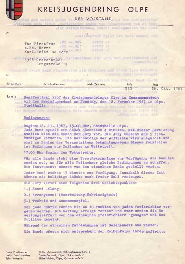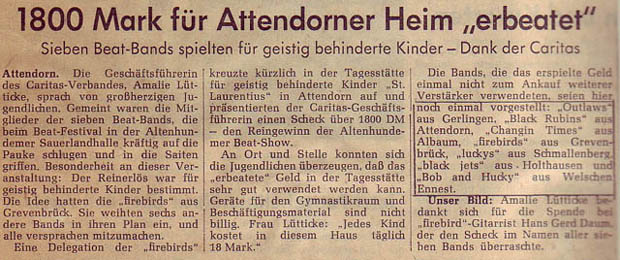 Karl Heinz weiß nicht mehr wo das war, aber die Fans der Band waren begeistert - das ist sicher. Die Gruppe wächst zusammen, wird eine Einheit. Äußerlich bleiben die Jungs sich treu. Schwarze Hosen und Westen, weiße Hemden und der Schlips sind bei Auftritten obligatorisch. Keiner der FIREBIRDS trägt eine Matte, Hippiedrogen sind verpönt, Pils vor und während der Auftritte nur in geringer Dosierung, danach... Die Band macht keine große Show auf der Bühne, sie spielt einfach gut und das ist Show genug. Das Jahr 1967 ist prall gefüllt mit Auftritten. Am 22. Jan. geht in der Sauerlandhalle in Altenhundem die Post ab. Sieben tolle Bands, an die meisten kann ich mich von vielen Beat-Veranstaltungen her erinnern, treten auf, reißen das junge Publikum mit, lassen es Schule und Lehre vergessen, heizen die Herzen ein und - spenden ihre Gagen, obwohl das Beatmusik - Machen damals ein verdammt teures Hobby war. Die FIREBIRDS hatten die Idee, die anderen Bands machten natürlich mit und DM 1.800 waren ne Menge Schotter!