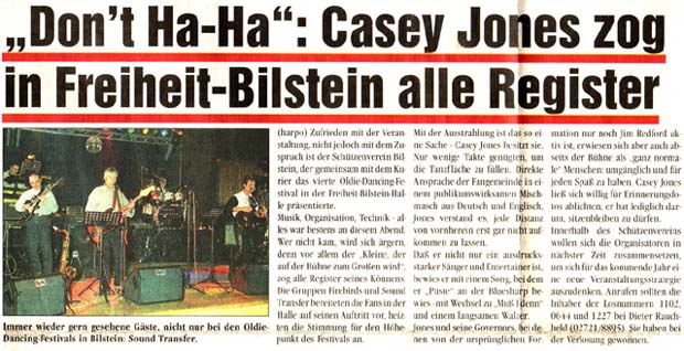 An den 27.Mai 1995 erinnert sich Karl Heinz sehr gern. Die "FIREBIRDS" waren von vielen der international bekannten Stars beeindruckt - und umgekehrt. Manche waren zickig, erzählt Karl Heinz, manche Damen benahmen sich wie Diven, die meisten waren nett und respektierten die Leistung der "FIREBIRDS". An diesem Abend spielten in Elspe: Boney M., Shocking Blue, Sailor, Pussycat, The Tremeloes und Herman`s Hermits und natürlich die "FIREBIRDS". Im Dez. 1995 spielten "SOUND TRANSFER" und die "FIREBIRDS" die Aufheizer für Casey Jones und den Rest der Governors. K. H. De Kock erinnert sich, dass Casey sehr nett und in guter Stimmung war. Hoffentlich ist das Hotel in Bilstein, in dem der Star übernachtete, heil geblieben!