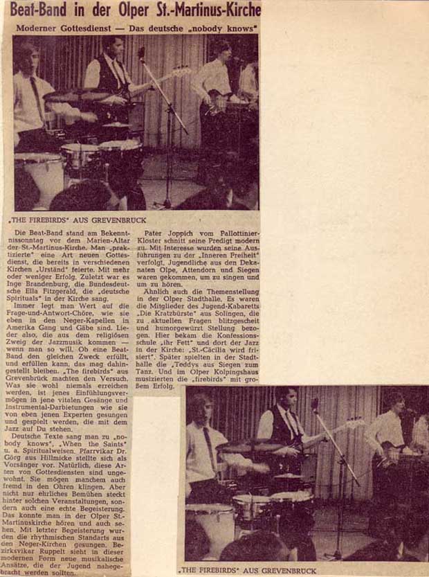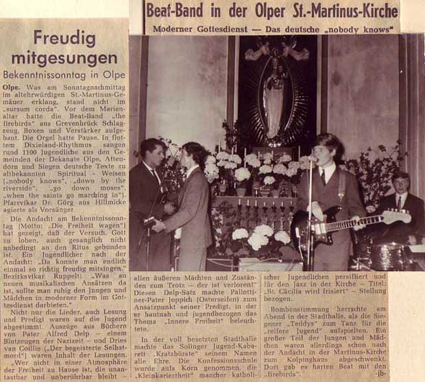 (für eine größere Ansicht den Zeitungstext anklicken)Am 23.Mai erlebt das katholische Olpe einen "modernen Gottesdienst" in der St.-Martinus-Kirche, eine "Beat - Messe", so wurde das genannt. Auch hier sollen die Presse - Berichte für sich sprechen! Den "FIREBIRDS" hat es Spaß gemacht und der abendliche Auftritt im Kolpinghaus war dann wieder richtiger Beat und Soul, so wie wir die Band hören wollten.