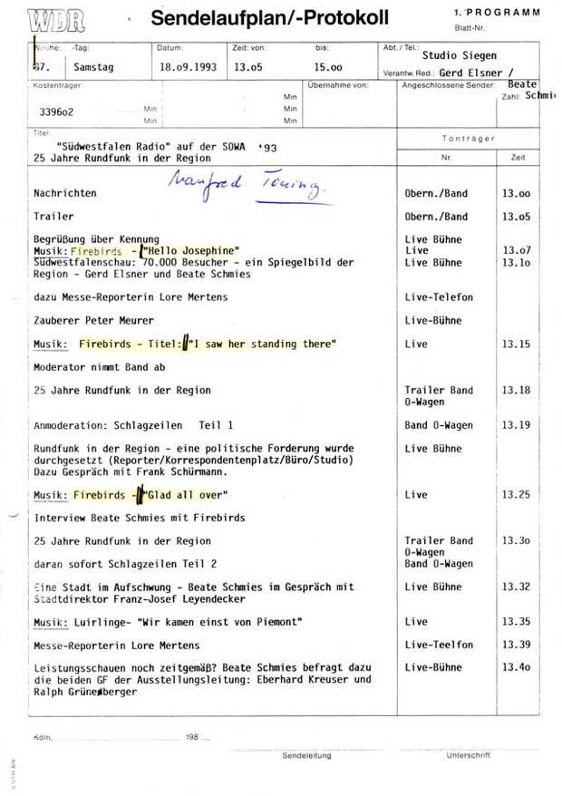 Klaus und ich merken, wie sehr Karl Heinz De Kock die Erinnerung an diesen Tag genießt. Musik machen mit Freunden und für Freunde - die "FIREBIRDS" sind wieder da ! Sie können es noch, sie wollen es noch, nur nicht mehr so oft, wie in den Sechzigern - das "auf der Bühne stehen". Eine Oldie-Night in Meggen - K. H. De Kock schätzt, daß es auch 1993 war und dann die Anfrage des "SÜDWESTFALEN RADIO" - die Band soll auf der SÜWA in Olpe spielen - live im Radio. Das ist eine echte Herausforderung und die Band sagt zu und ist noch heute von der technischen Organisation und der Perfektion des Ablaufs beeindruckt.